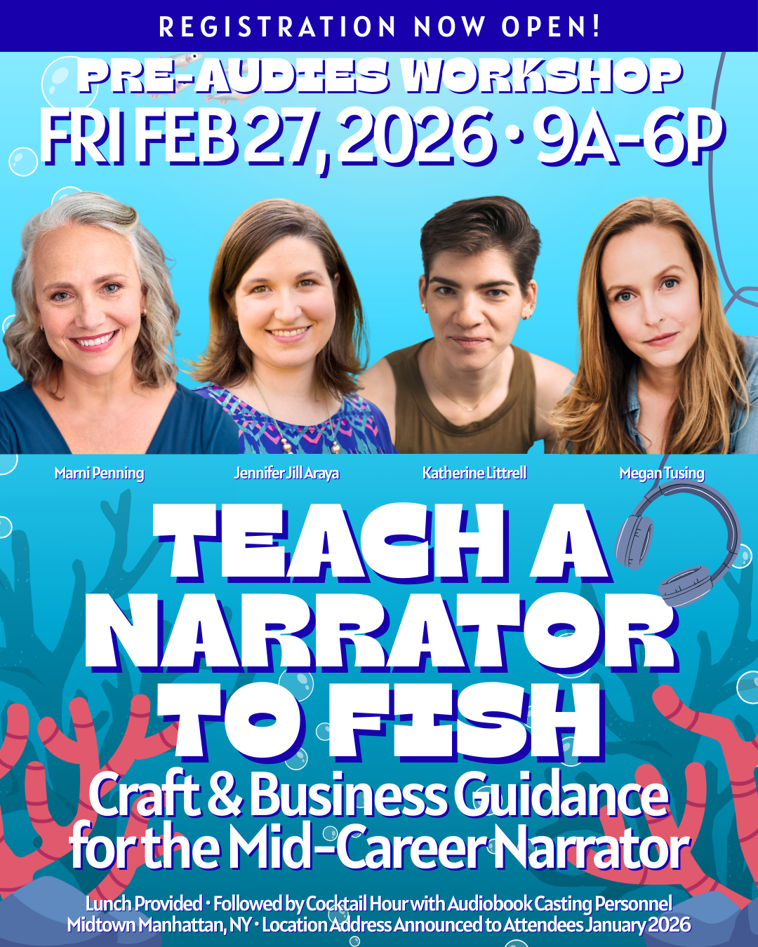 Are you a mid-career audiobook narrator looking to sharpen your craft and grow your business? Join industry coaches Jennifer Jill Araya, Katherine Littrell, Megan Tusing, and Marni Penning for an immersive, day-long workshop designed to give you the tools, strategies, and confidence to take your career to the next level.